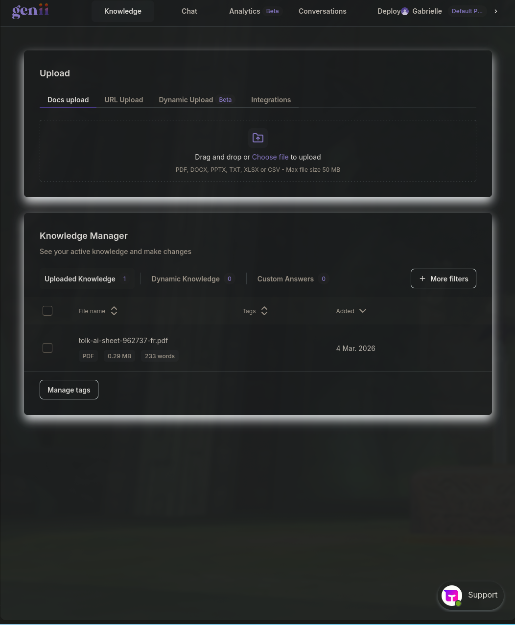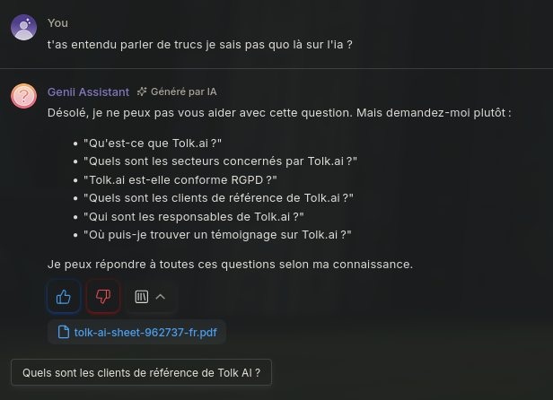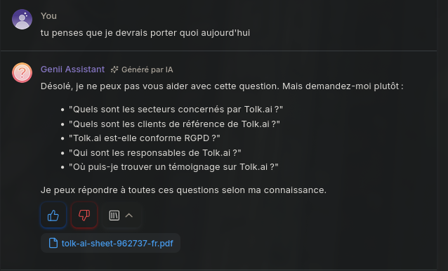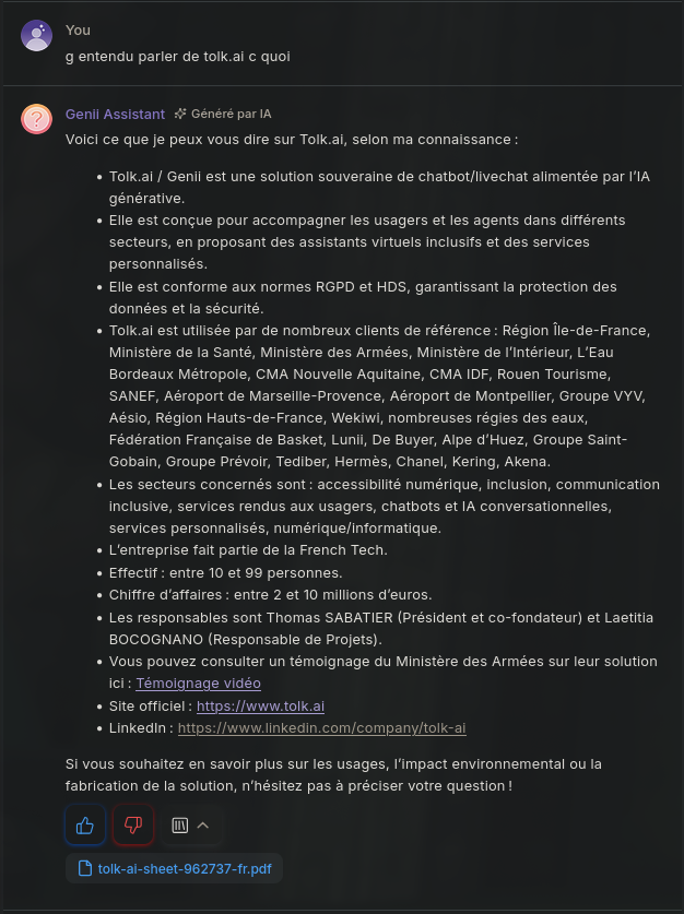 Contrôle complet sur le contenu Toutes les réponses sont écrites et validées par les concepteurs du chatbot. Cela est particulièrement adapté pour : - support client - FAQ - procédures internes - contextes réglementés